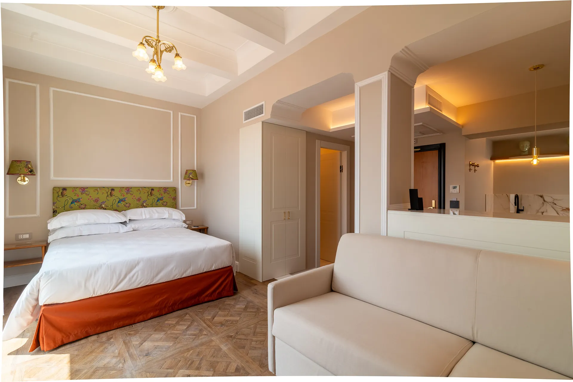 Viaggi in famiglia? Scegli le nostre camere Family con letto King Size e divano letto doppio.